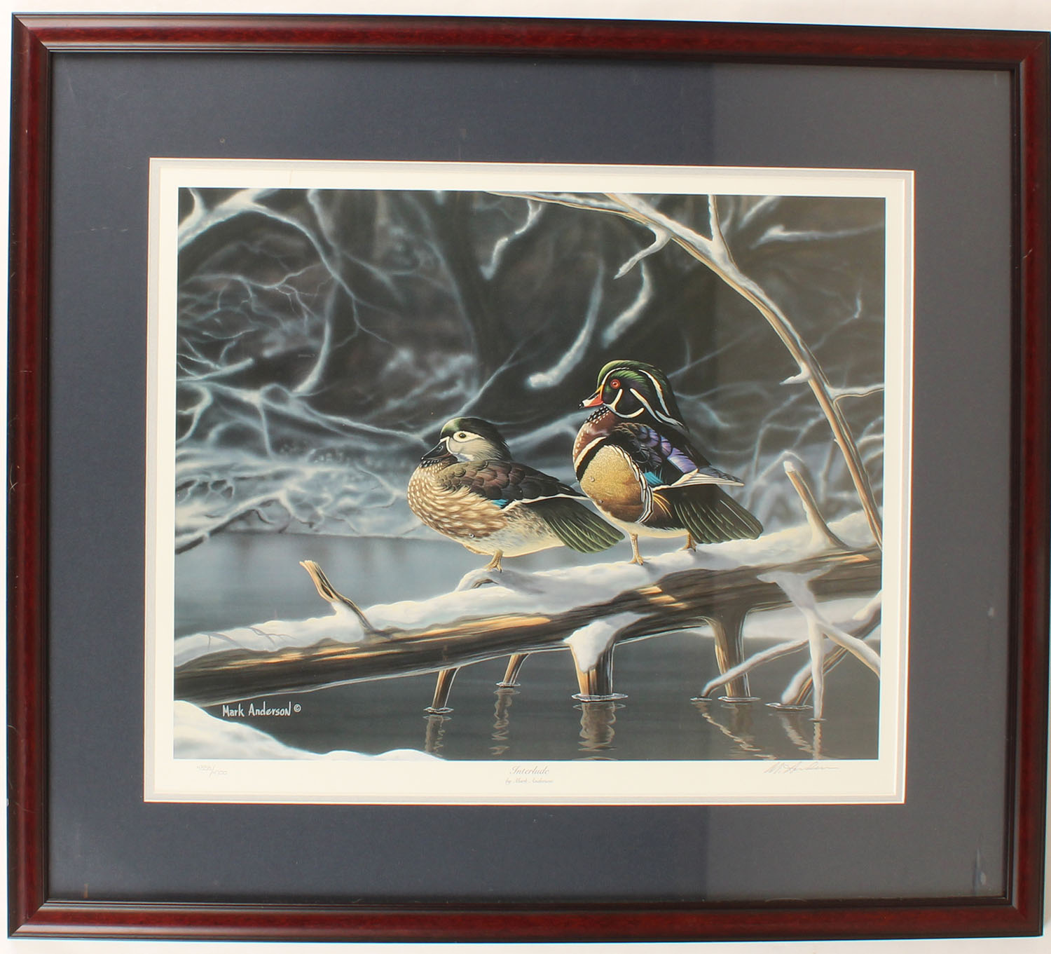 Enterlude by Mark Anderson, pictures two woodducks on snowy log over pond, beautiful full color image, 21'' x 17'' image size, framed & matted, 4333/4700. Grade: MINT - Value: 20 to 200