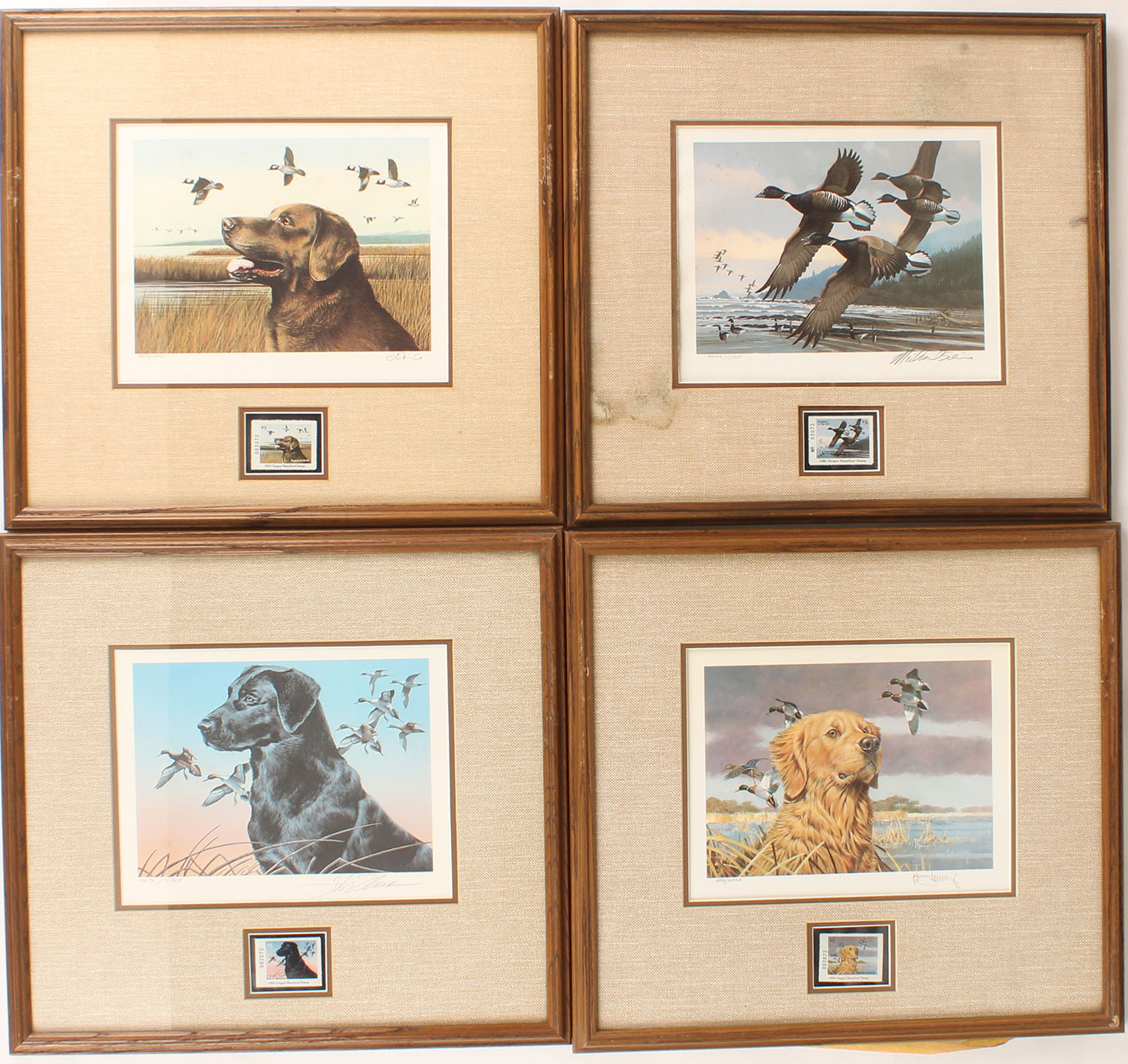 Lot of 4 Oregon State Duck stamps & prints, all are No. 2072/11825, 9'' x 6 1/2'' image size, framed & matted, some show ware. Grade: Very Good ++ - Value: 200 to 300