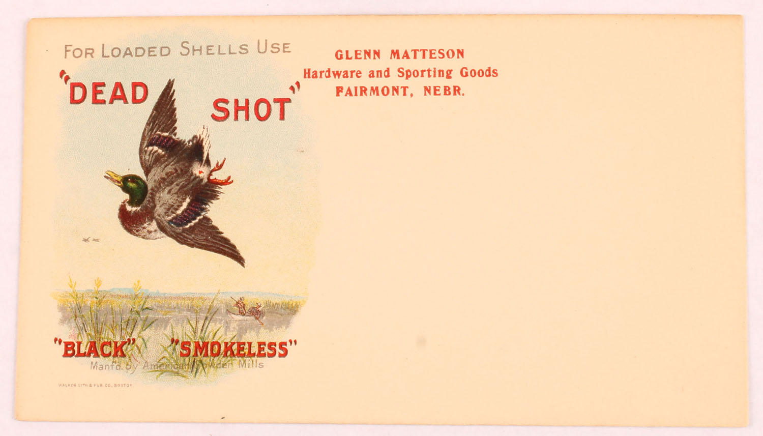RARE Dead Shot Black Smokeless Envelope, unused, has full color image of falling mallard logo with hunter shooting in background. Grade: Excellent ++ - Value: 100 to 300