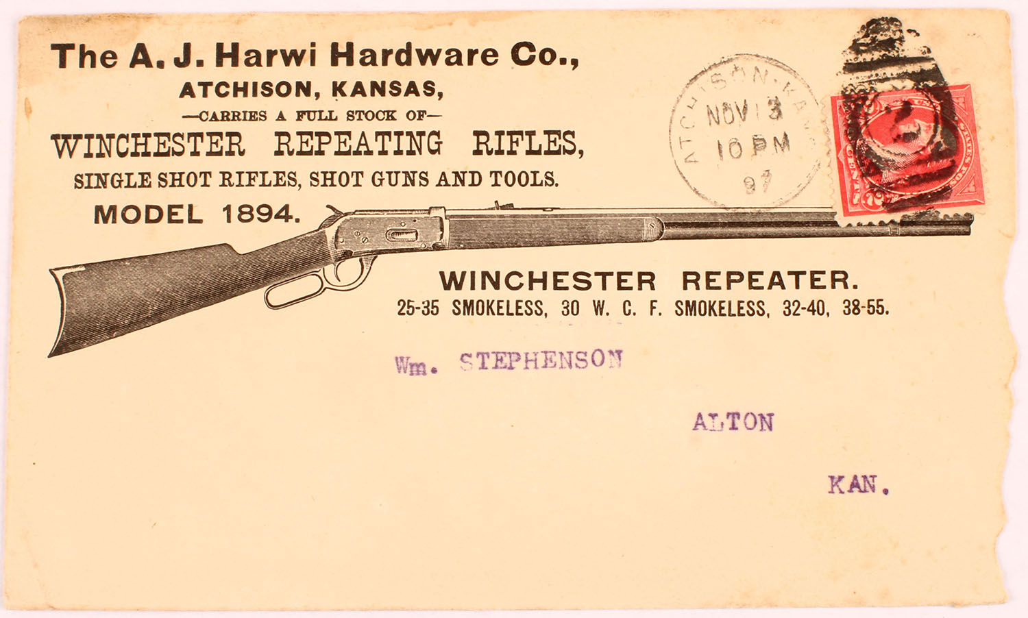 Winchester Repeating Rifles, Single Shot Rifles, Shot guns and Tools Envelope, dated 1897, pictures rifles on back, torn on right side. Grade: Very Good - Value: 10 to 60