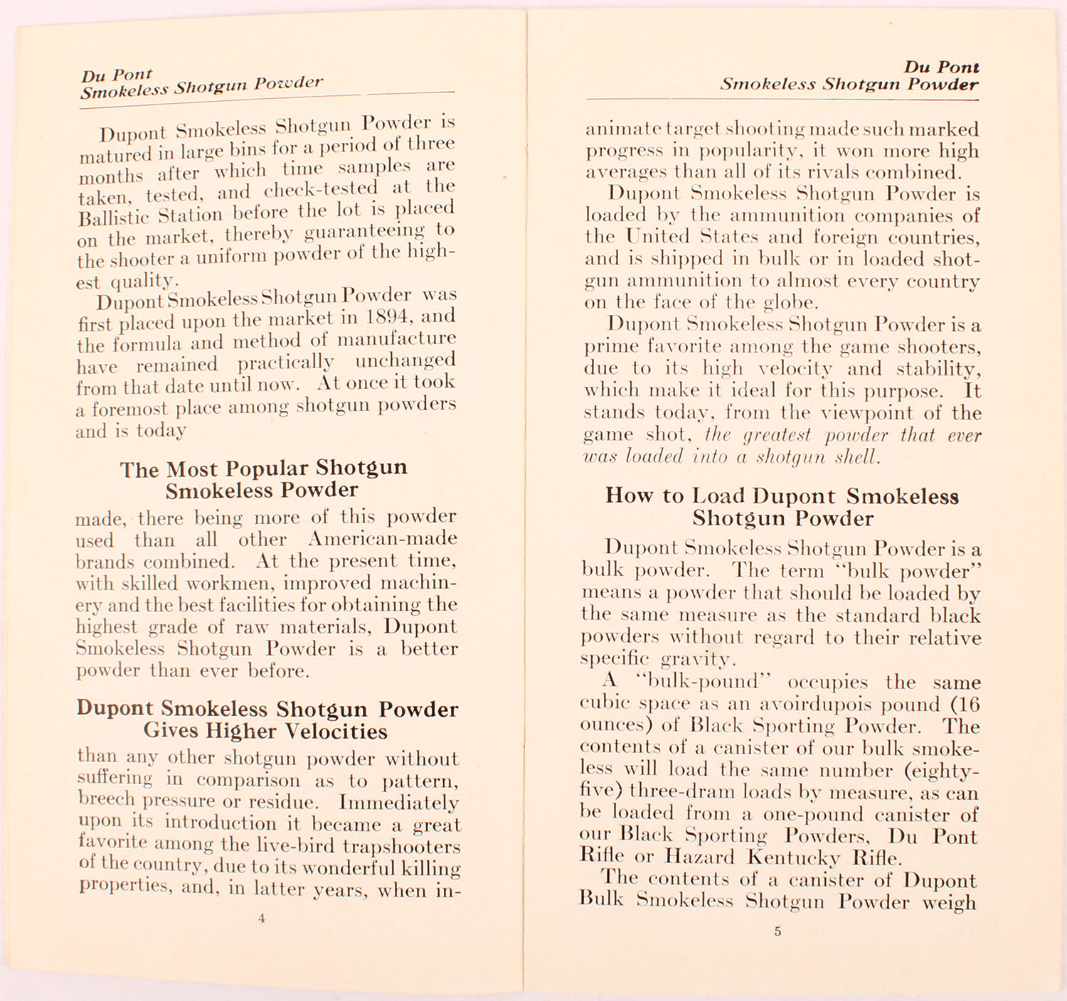 Du Pont Bulk, Ballistite Dense booklet, full color cover pictures father & sone hunting in a snowy scene, 3 1/2'' x 6'', 37 pages, From A 1236* 30M 2-22, Circa 1922. Grade: Excellent ++ - Value: 10 to 100