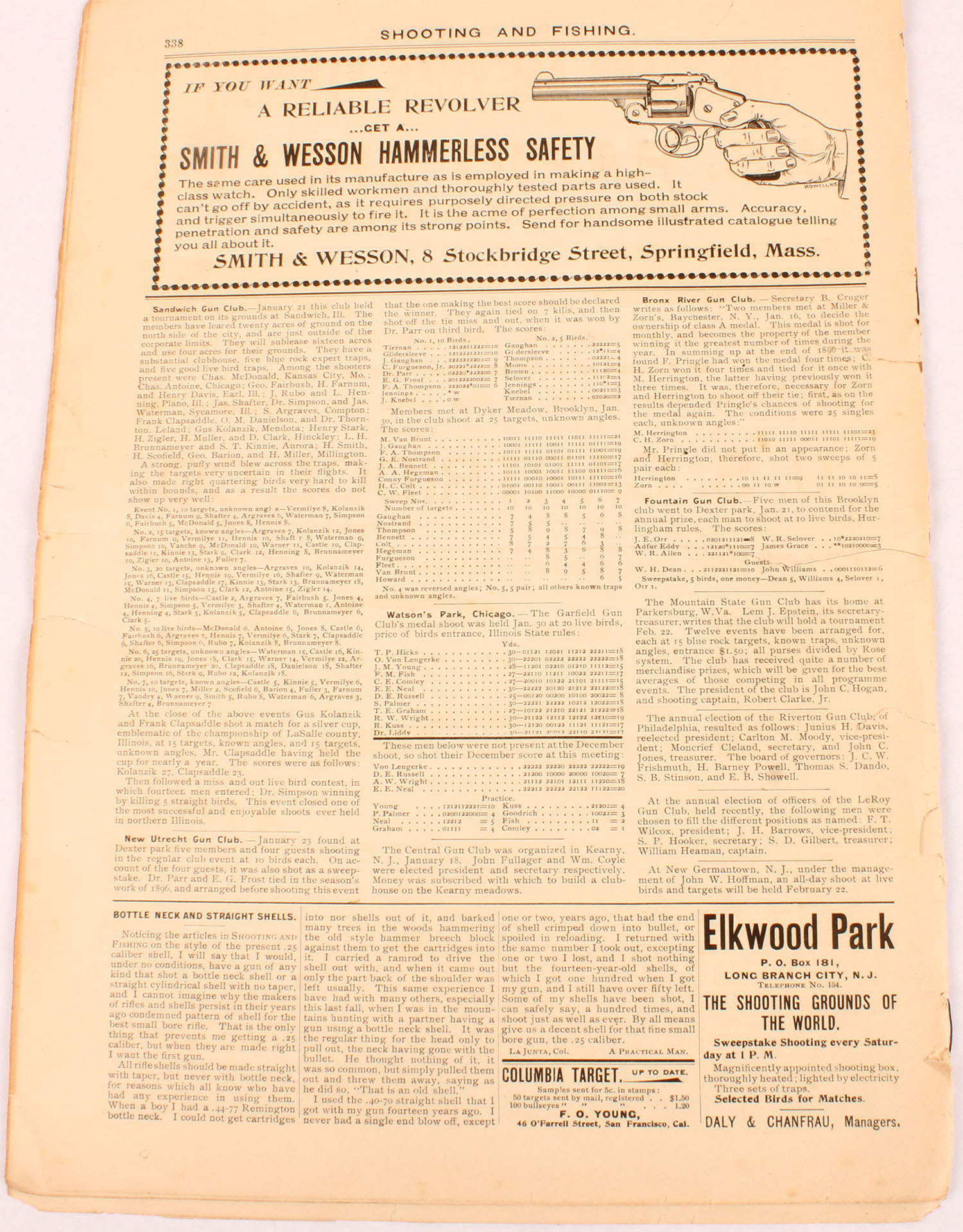 1897 Shottong & Fishing Magazine, many images of guns, ammo & fishing, 15 1/2' x 15'', about 14 pages. Grade: Good ++ - Value: 2 to 30