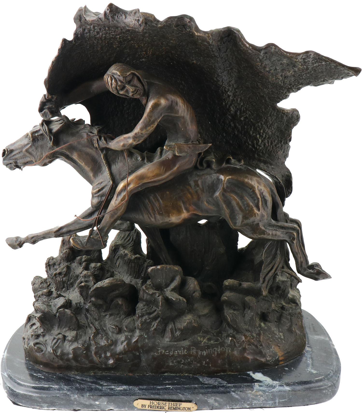 Bronze by Fredrick Remington ''HORSE THIEF'', has marble base, wonderful detail, 20'' x 21'' x 10'', also signed on base. Grade: Excellent ++ - Value: 400 to 2000