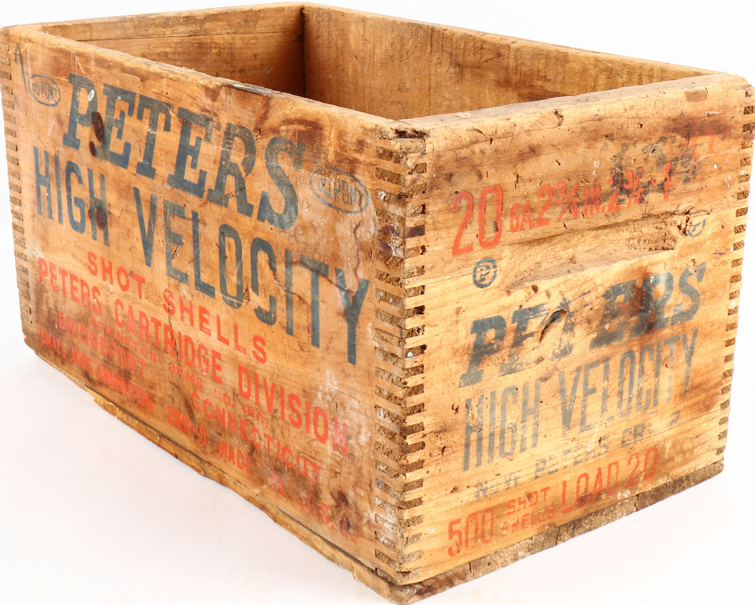 Peters High Velocity 20 ga., 6, tongue and groove construction, orange and blue print is fading, has age soiling. Grade: Very Good - Value: 10 to 50