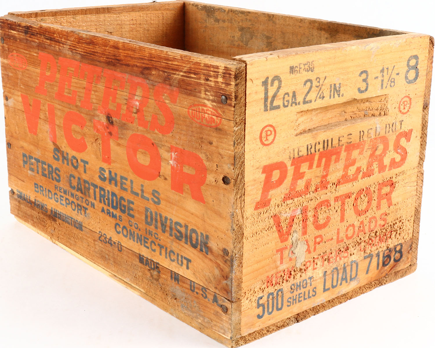 Peters Victor 12 ga., 8, tongue and groove construction, orange and blue print is solid, crate has age soiling. Grade: Very Good ++ - Value: 10 to 50