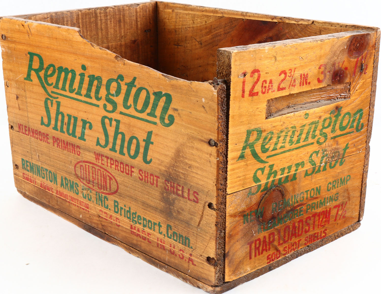 Remington Shur Shot, 12 Ga., 7 1/2 shot, nail construction, red, & green print is faded and crate has age soiling. Grade: Very Good - Value: 10 to 50