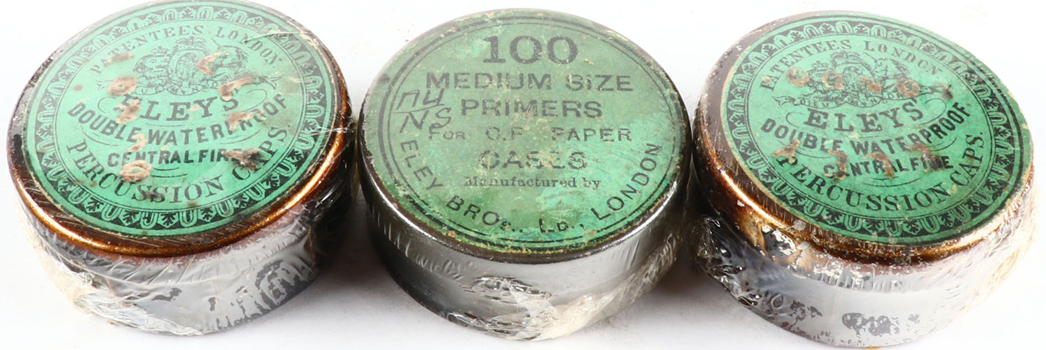 Lot of 3 Early Eley Percussion caps, all Full. Grade: Excellent - Value: 6 to 60