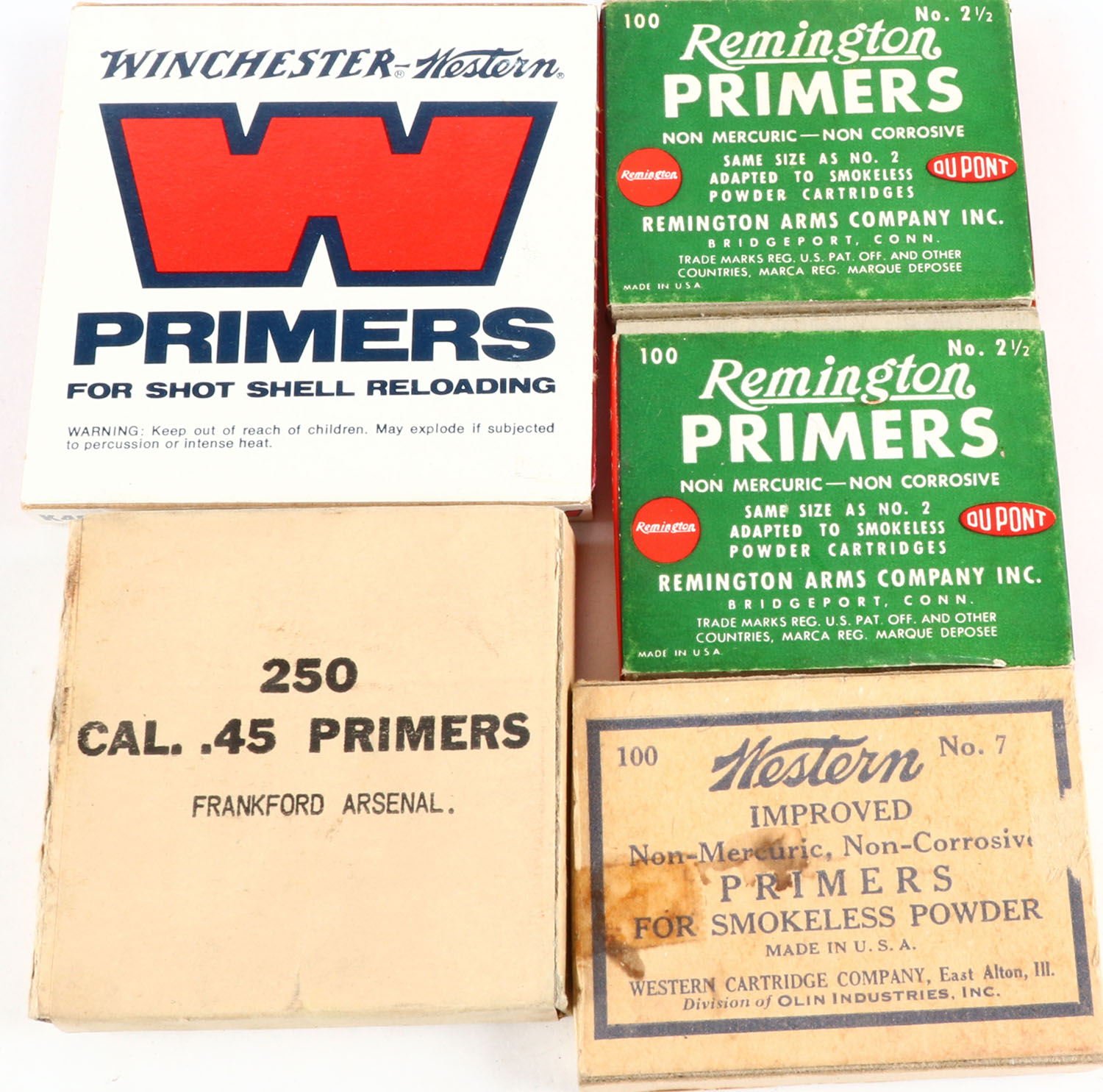 Lot of 5 primer boxes, all Full, both have age soiling. Grade: Very Good - Value: 4 to 60