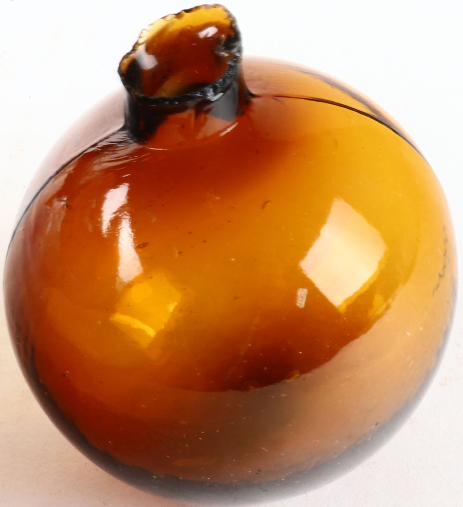 RARE! Amber Glass Target Ball, smooth 2 piece ball, 2 5/8'' dia., medium-High neck, circa 1880-1900. Grade: Excellent ++ - Value: 300 to 600