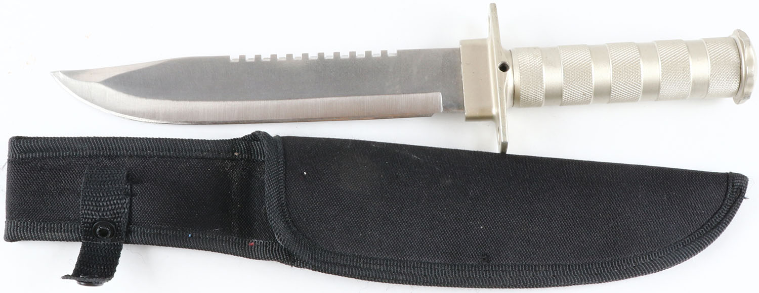 Survival knife, 8'' fixed blade, handle has a compartment that holds line, band aids and other items with a compass built in, has sheath. Grade: Very Good ++ - Value: 20 to 60