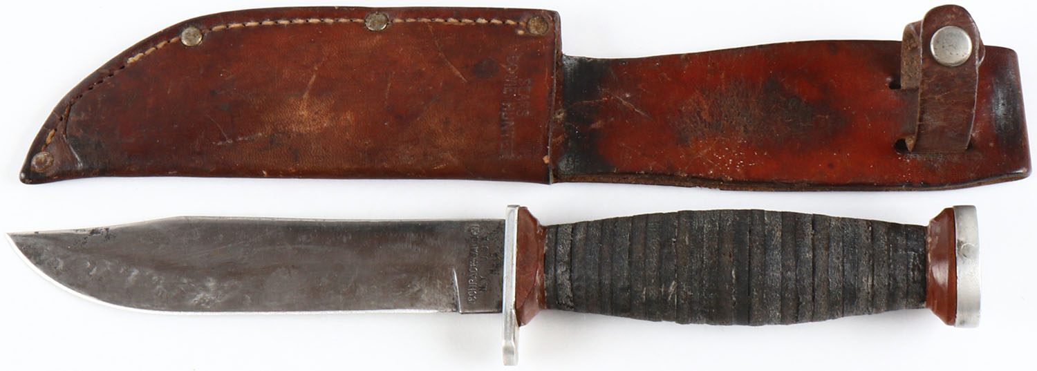 Schrade-Walden knife, leather washer handle, 5'' fixed blade knife, has leather sheath, blade has been sharpened. Grade: Very Good - Value: 16 to 60