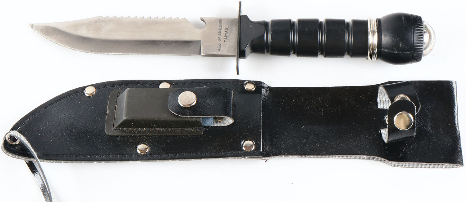 Stainless steel knife, 5'' fixed blade knife, has leather sheath with flint piece, and compass on pommel. Grade: Very Good ++ - Value: 10 to 50