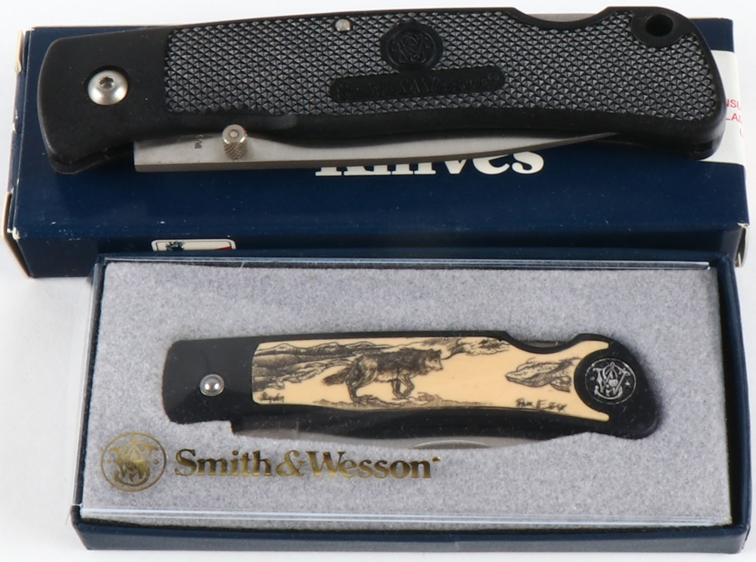 Lot of 2 S&W folding knives, in original box, all bright and clean. Grade: Excellent ++ - Value: 20 to 80