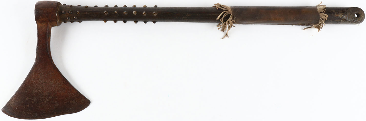 Antique Native American hatchet, 23'' OAL, well made, has wear, has impression on axe head, circa 1800s, . Grade: Very Good + - Value: 100 to 500