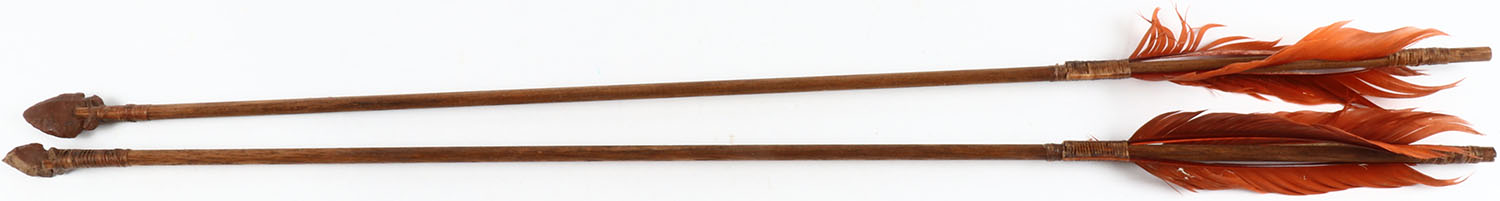Antique arrows, 29'' OAL, arrows and feather are held on with a sinew wrap, . Grade: Very Good - Value: 20 to 200