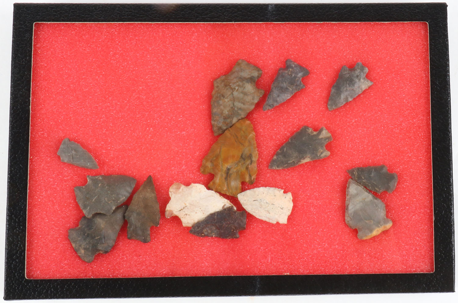 Large lot of Antique Native American spear and arrow heads, various shapes, framed in glass, 12 1/2'' x 8''. Grade: Very Good ++ - Value: 50 to 150