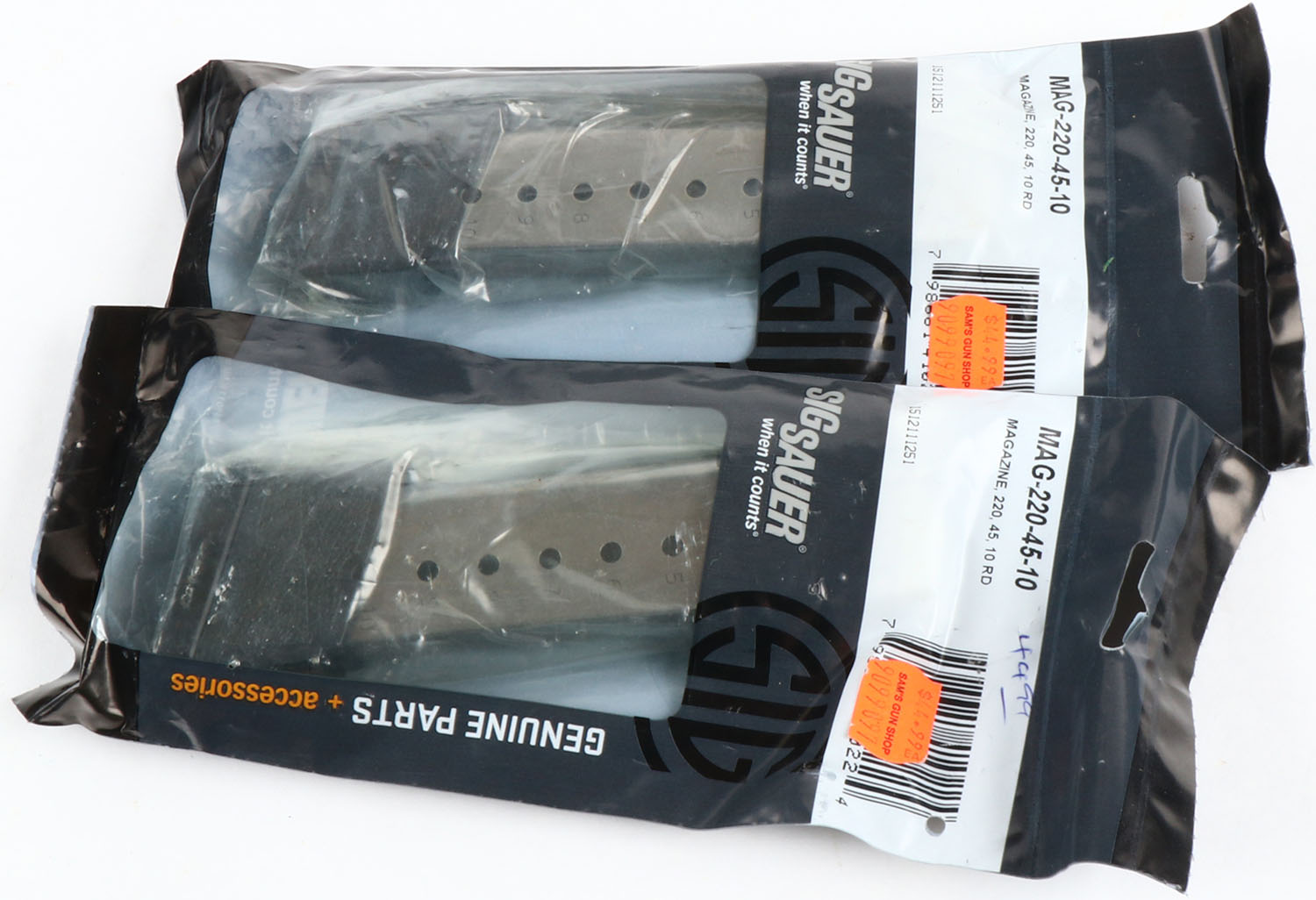 Lot of 2 Sig Sauer P 220 mags, 45 cal, 10 rd mags, sealed in original packaging . Grade: Excellent ++ - Value: 20 to 100