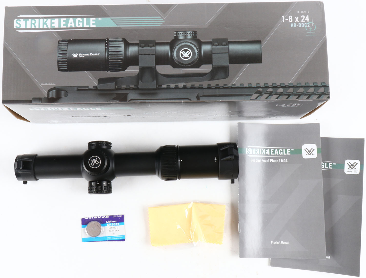 Vortex, Strike Eagle , 1-8 x 24mm, Variable Magnification Rifle Scope, NIB, 30mm Tube Diameter, Second Focal Plane AR-BDC2 Illuminated Reticle, Fixed Parallax, Fast Focus Eyepiece, Nitrogen Gas Purged Aircraft Grade Aluminium Housing, Waterproof, Fog proof, Shock Proof, 10 Inches long, weighs 16.5 Ounces, Low Height capped turrets have 100 MOA of internal adjustment for elevation and windage, clicks are audible and positive, 1/2 MOA Clicks, Fully Multi-Coated Chinese Glass, comes with Flip-Up Lens Covers, CR2023 Battery, cleaning cloth, and Vortex's unbeatable Unconditional Lifetime Warranty. Gade: MINT - Value: 300 to 600