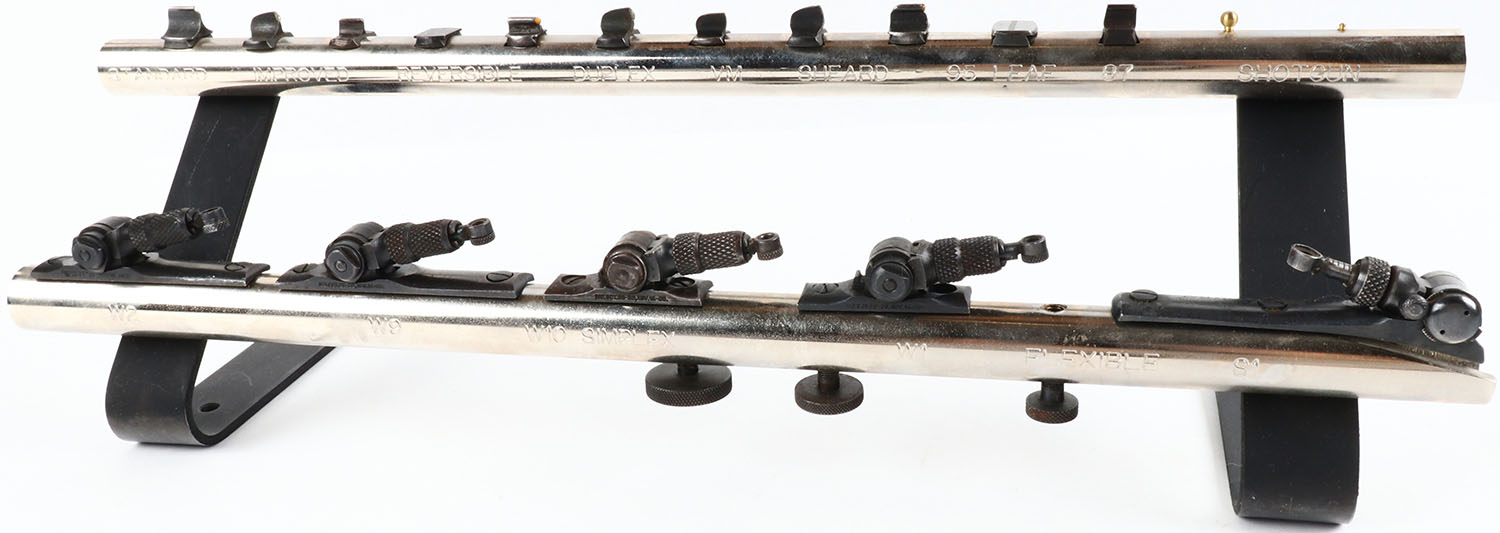 VERY RARE! Original Marbles Sight Display Stand, featured in 1924 catalog, displayed has various tang sights, front sights & aperture discs., types of Sight marked on rods, only ever offered 1 before. Grade: Excellent - Value: 1000 to 4000