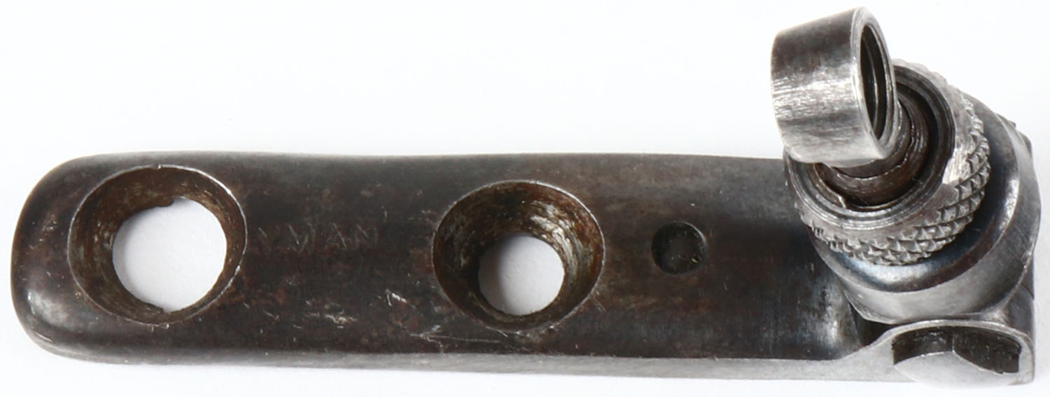 Lyman Tang Peep Sight, R12 stamped on bottom, but not the typical R12 & won't fit a Remington Model 12. Holes have been drilled out & enlarged. Bottom has been ground or modified. Grade: Good - Value: 40 to 200