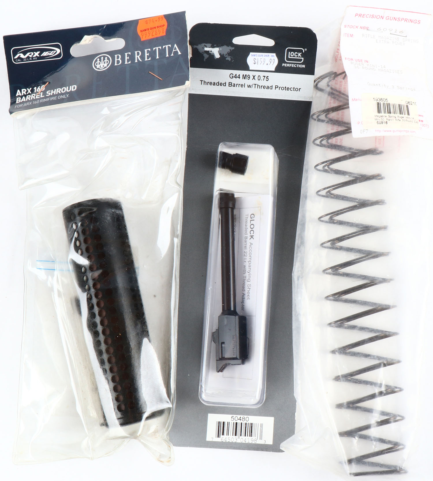 Beretta ARX 160 BARREL SHROUND Glock G44 9 X 0.75 & Precision gun spring, all NIB. Grade: MINT. - Value: 10 to 100