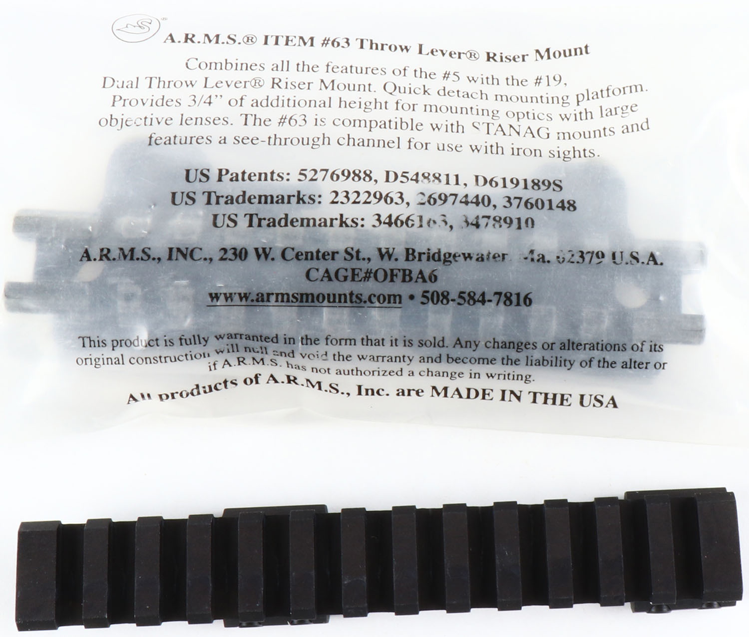 Lot of 2 items, Adapter Rail CZ 527, 16mm dove tail & a A.R.M.S. Item #63 Throw Lever Riser Mount, Combines all features of the #5 with the #19 dual throw lever riser mount, Quick detach mounting platform, provides 3/4'' of added height for mounting optics with large objective lenses. Both are NIB. Grade: MINT - Value: 10 to 150