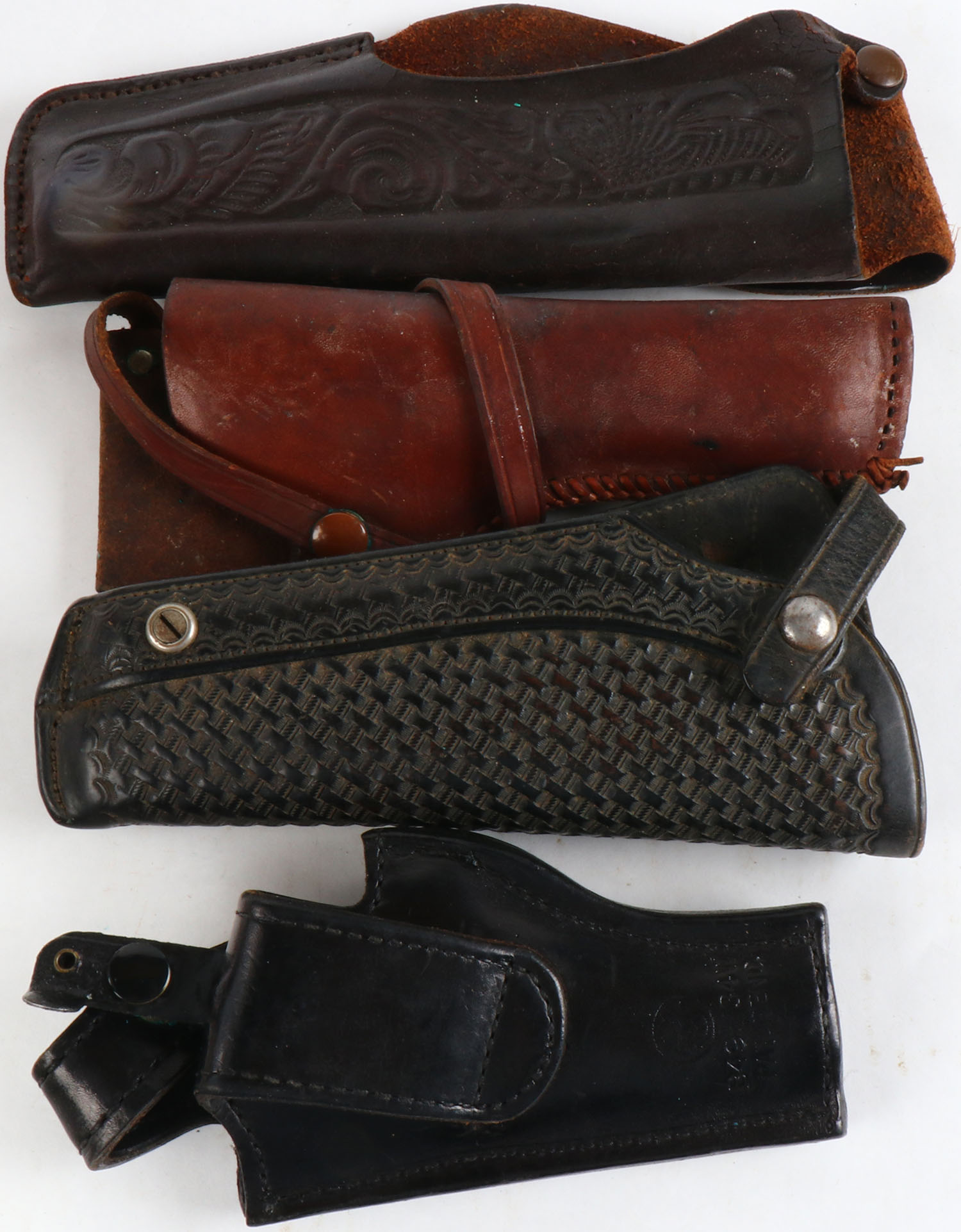 Lot of 4 leather holsters, three have tooling. Grade: Excellent - Value: 10 to 60