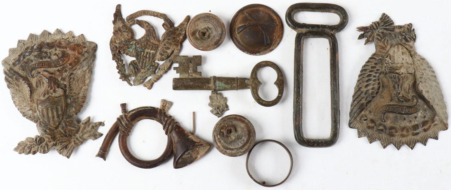 Lot of tin military symbols with key & buttons. Grade: Good - Value: 2 to 30