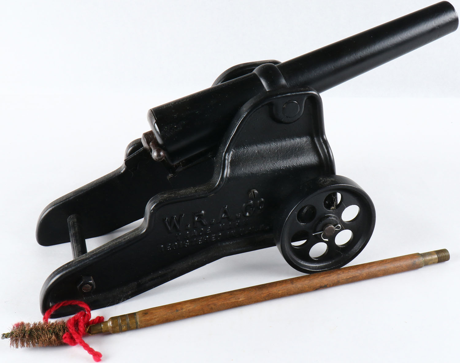 RARE! Original Winchester 10 ga. Winchester Cannon, metal wheels, unfortunately this one has been reblued, the famous Winchester Model 98 Breech Loading Signal Cannon was first offered in Winchester's 1903 catalog. It was described as: ''a breech loading cannon possessing safety, simplicity of construction, and ease of manipulation....'', Circa 1930's. Grade: Very Good + - Value: 500 to 3000