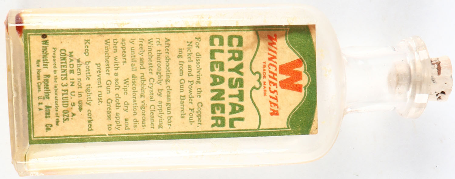 Winchester crystal cleaner glass jar, Empty, cork top, label on jar is very good. Grade: Excellent - Value: 10 to 50