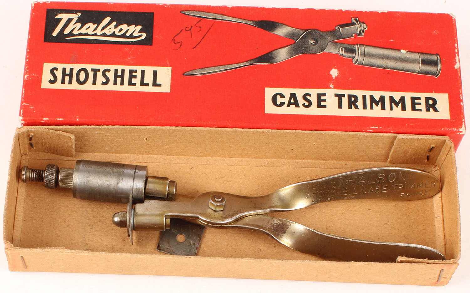 Thalson Shot Shell Case Trimmer in original box, box is solid with excellent color, very minor shelf & corner wear, top has been written on, trimmer is solid and functions properly, comes with 2 blades, blades are very sharp. Grade: Excellent ++ - Value: 10 to 100