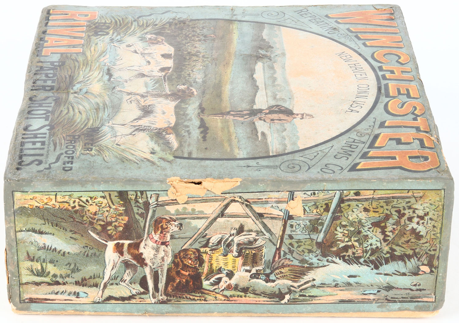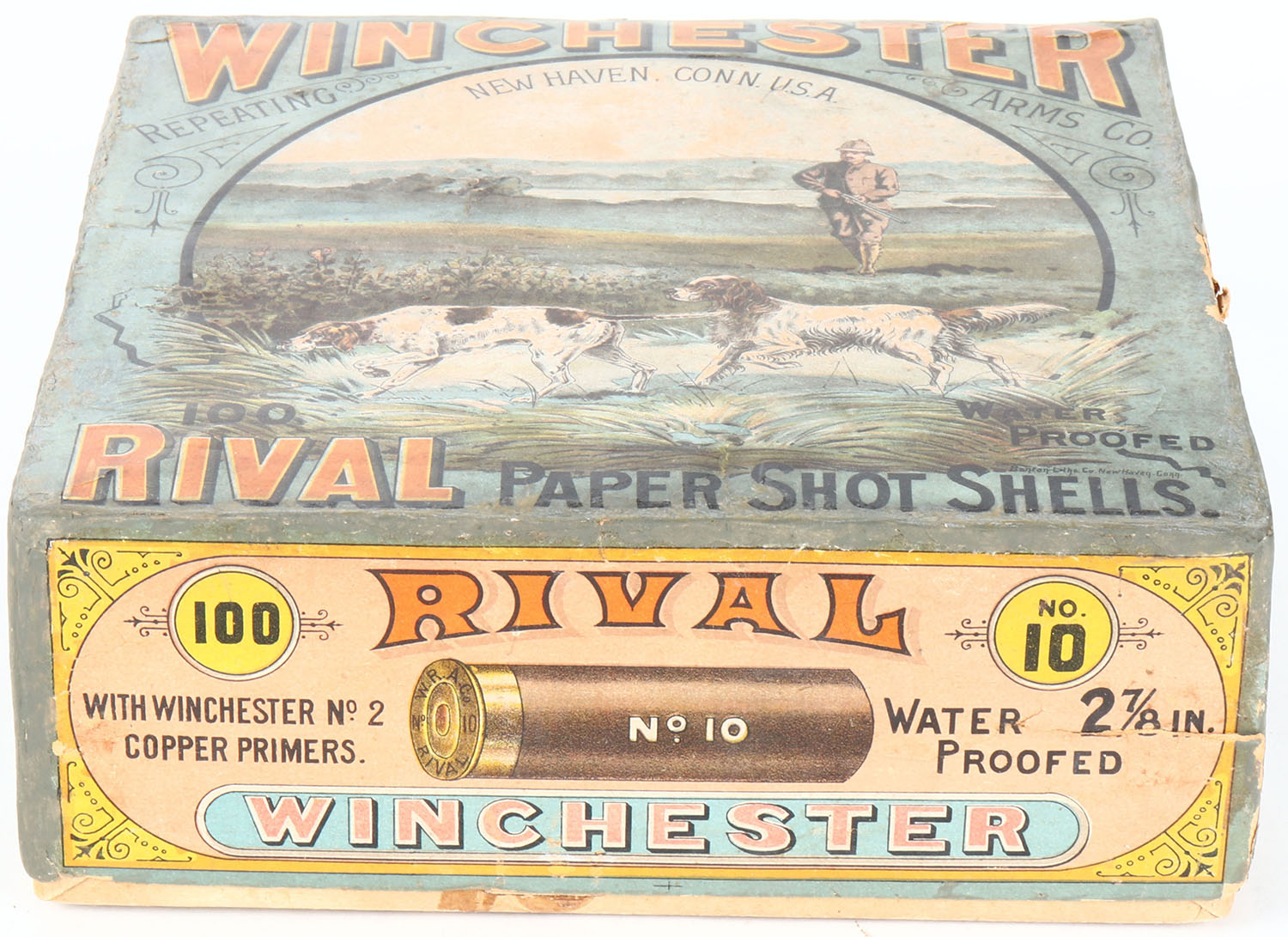 Winchester Rival 100ct. Christmas Box, EXTREMELY RARE, 10ga, 2pc., 85% Partial of NPE, 2 7/8'', multi colored box with hunter and two dogs on top label, box has light soiling, light edge wear, some tears, & box has been professionally touched up on edges, Shells are good. Grade: Very Good ++ - Value: 8000 to 20000