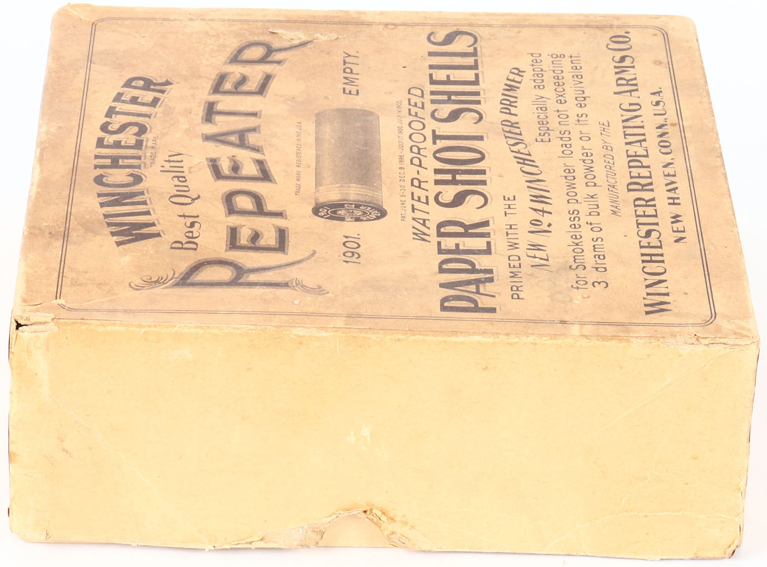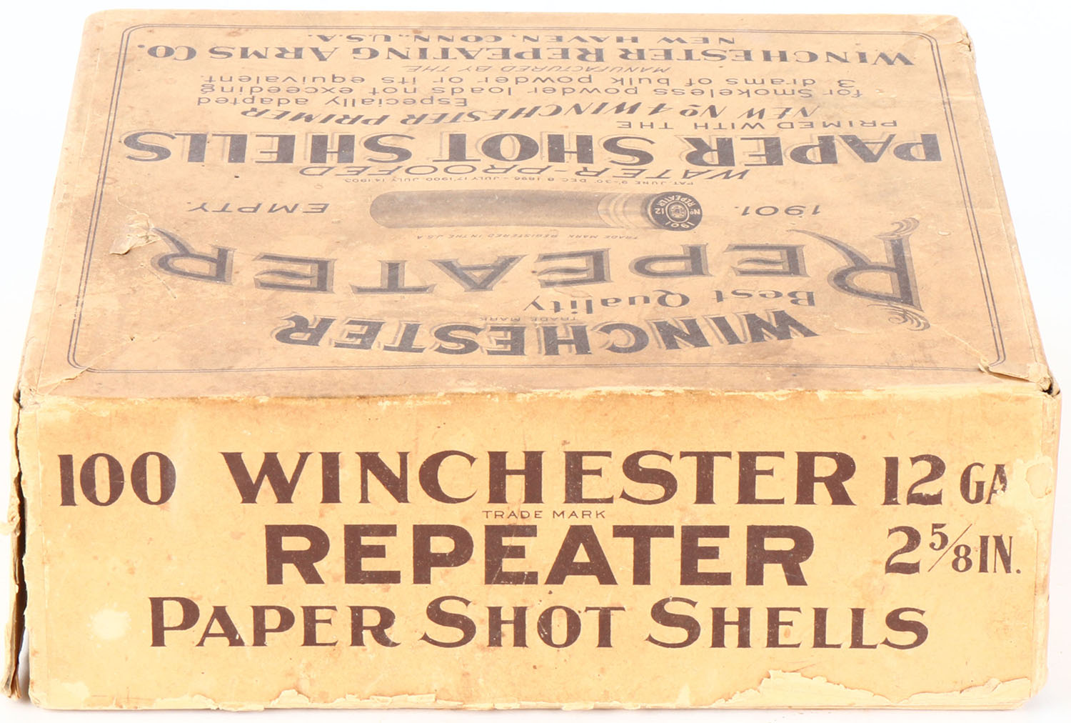 Winchester, Repeater, NPE, 12ga, 2pc., Empty, 2 5/8'', buff box with buff and black label, box has light edge wear, seam splits and soiling. Grade: Very Good ++ - Value: 100 to 500