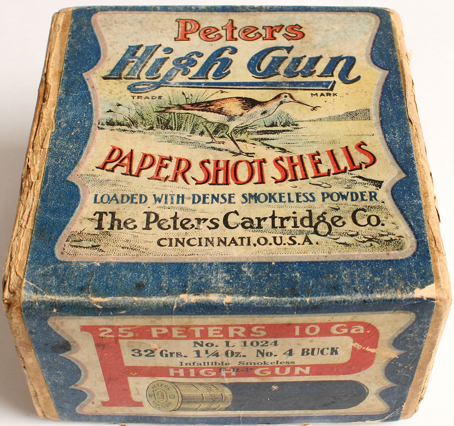 RARE! Peters Cart. Co., HIGH GUN, 10ga, 2pc., Empty, shot size 4 Buck Shot, buff box with multi colored picture of Snipe, Loading: No. L. 1024, 32 Grs., 1 1/4Oz. 4 Buck Shot, Infallible Smokeless, box has light soiling with edge wear and tape repair, label is very good with light scuffing. Grade: Very Good ++ - Value: 500 to 1000