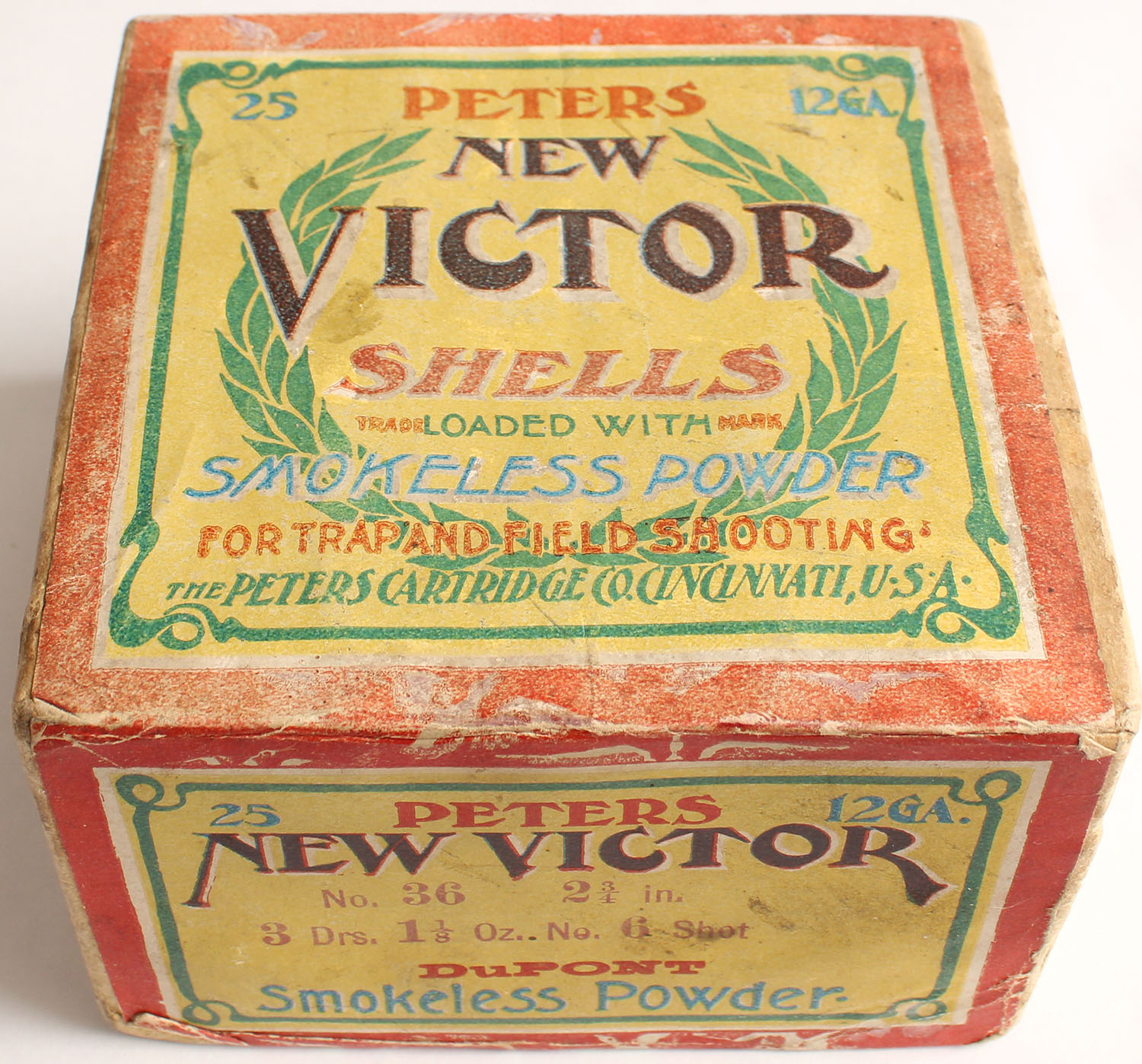 Peters Cart. Co., New Victor, 12ga., 2pc., Empty, shot size 6 shot, buff box with multi-colored label, Loading: No. 36, 3 Drs., 1 1/8 Oz. No. 6 Shot, Smokeless Powder, box has very nice label with bottom label being correct & being 100% intact, box has light age soiling & light scuffing. Grade: Very Good ++ - Value: 800 to 2000
