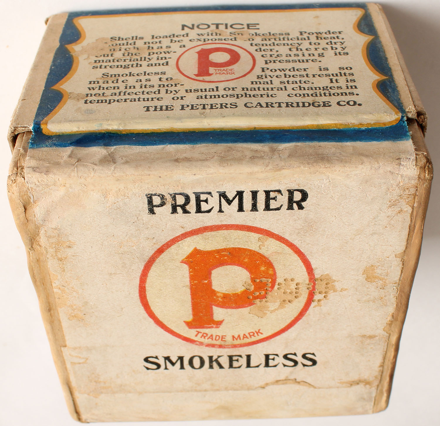 Peters Cart. Co. PREMIER, 20ga., 3'', 2pc., FULL & Professionally RESEALED/touched up, shot size 6 Ch, buff box with multi colored label that pictures a flying Prairie Chicken, box has light scuffing & light age soiling. Grade: Excellent - Value: 500 to 2000