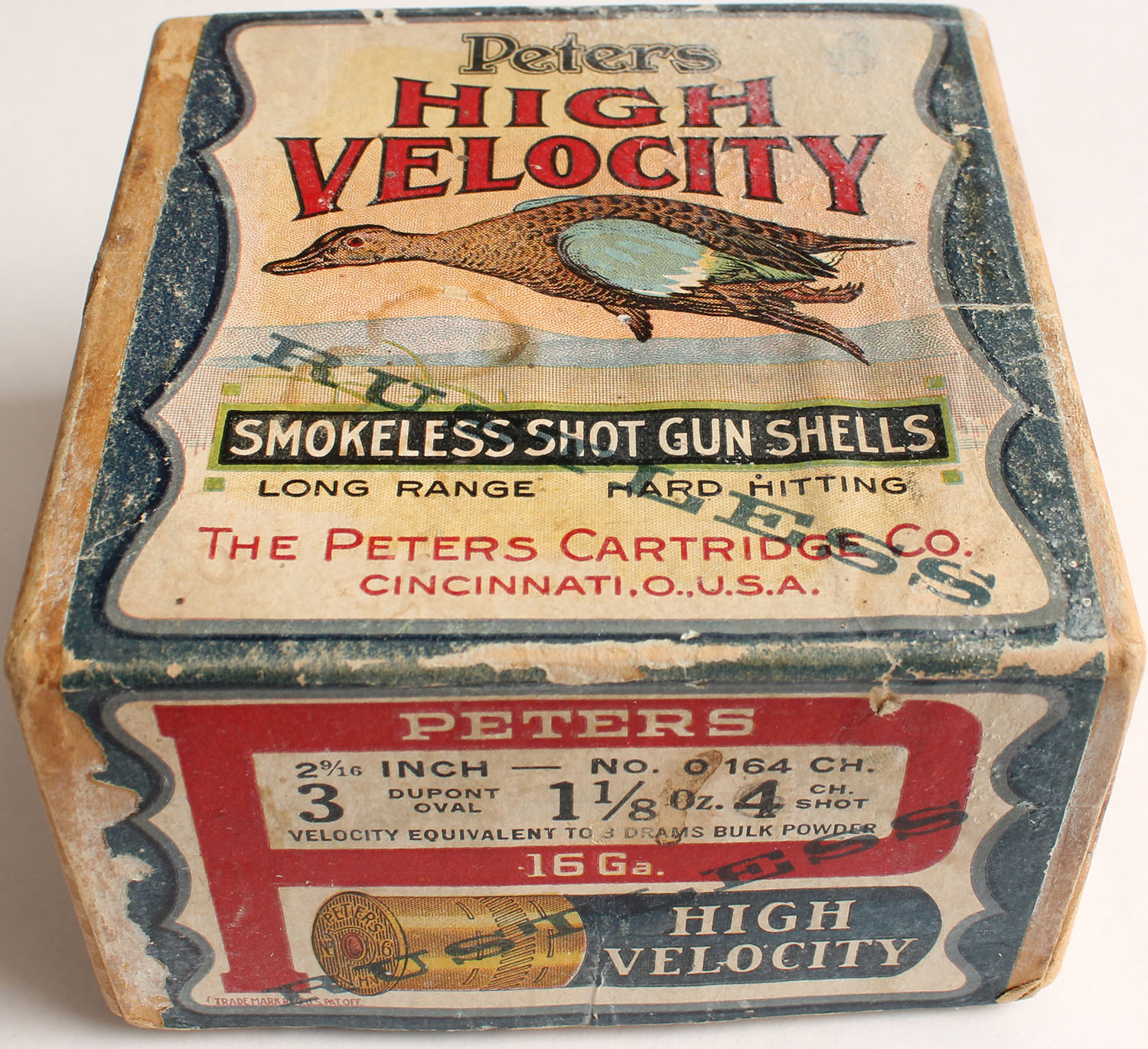 Peters Cart. Co., Blue Wing Teal, OVER STAMPED ''RUSTLESS'', 16ga., 2 9/16'', 2pc., Empty, shot size 4 CH, buff box with multi colored label that pictures Blue Wing Teal in flight, box has light soiling & light edge wear with very nice colors. Grade: Very Good ++ - Value: 100 to 400