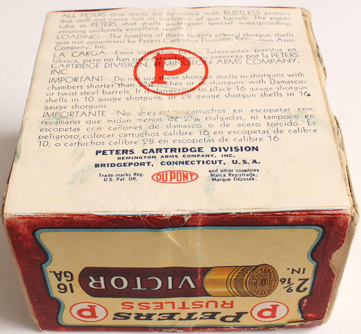 Peters Cart. Div., Victor, Rustless, 16ga., 2 9/16'', 2pc., FULL & SEALED, shot size 0 Buck, buff box with maroon, cream & orange label, box is very solid with light edge wear, label is torn but has great colors. Grade: Excellent - Value: 50 to 250