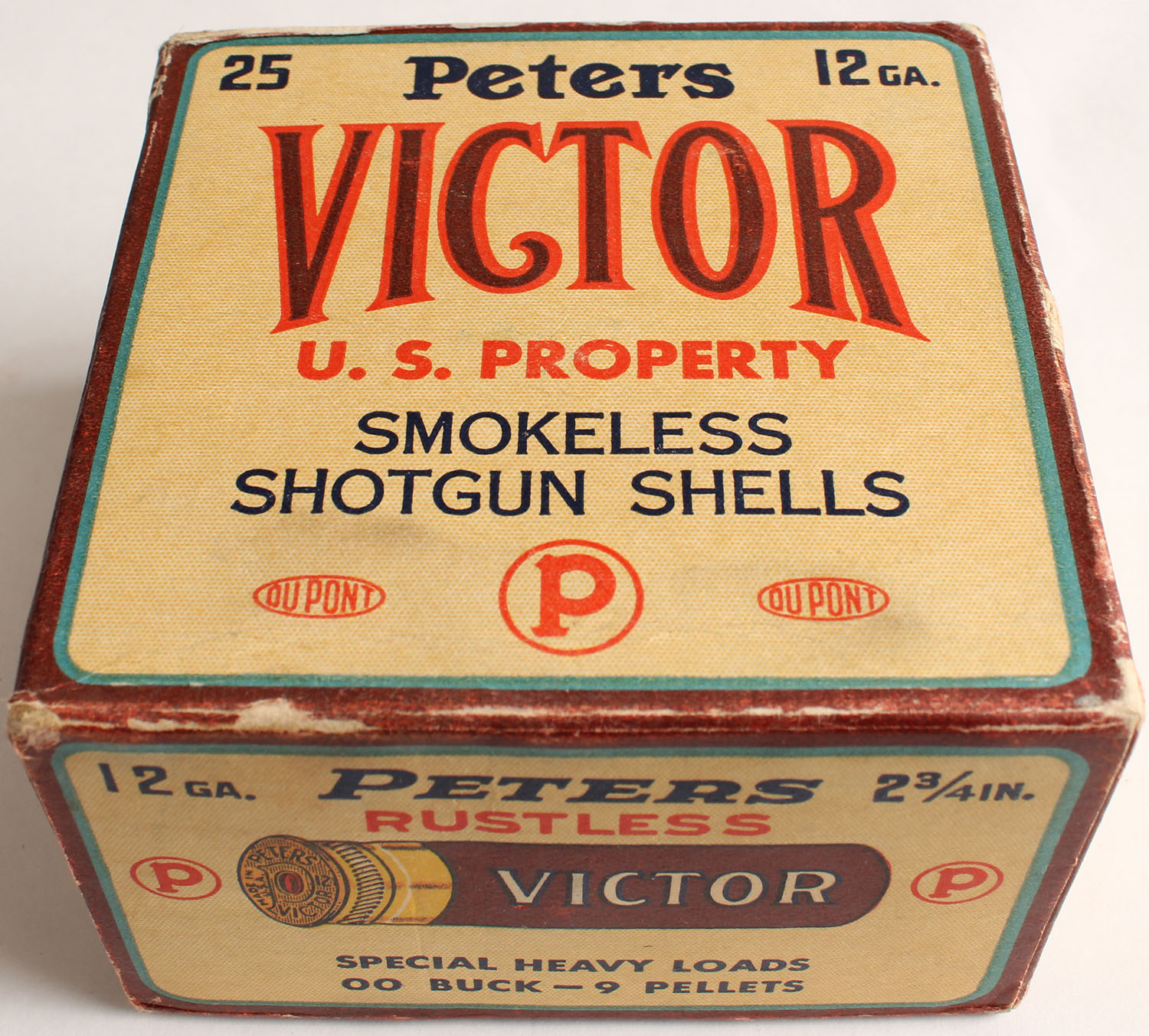 Peters Cart. Div., Victor, U.S. Property, 12ga., 2 3/4'', 1pc., Full, shot size 00 Buck, 9 Pellets, maroon, cream & orange box, box is very solid with small shell protrusion & light edge wear, box has great colors, Shells are good. Grade: Excellent - Value: 20 to 80