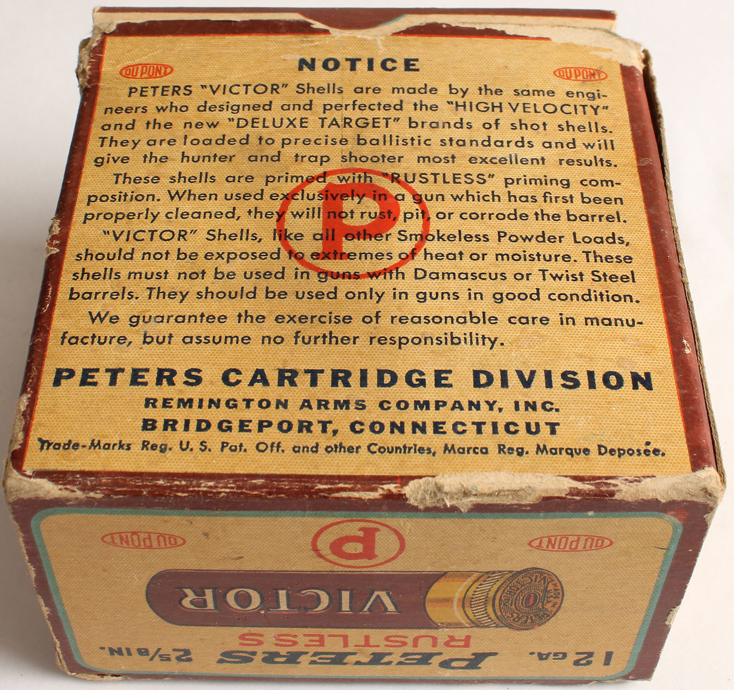 Peters Cart. Div., Victor, Rustless, 12ga., 2 5/8'', 1pc., Partial 21rds, shot size 5, maroon, cream & orange box, box is solid with light soiling, light scuffing & inside flap is torn, box has nice colors, Shells are very good. Grade: Very Good ++ - Value: 20 to 60