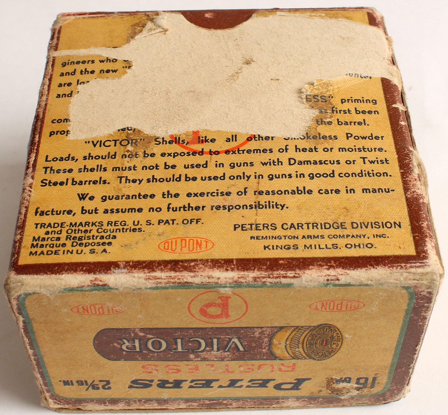 Peters Cart. Div., Victor, Rustless, 16ga., 2 9/16'', 1pc., Full with 1rd being fired, shot size 6, maroon, cream & orange box, box is solid with soiling, edge wear & scuffing, box has okay colors, Shells are good. Grade: Good + - Value: 10 to 40
