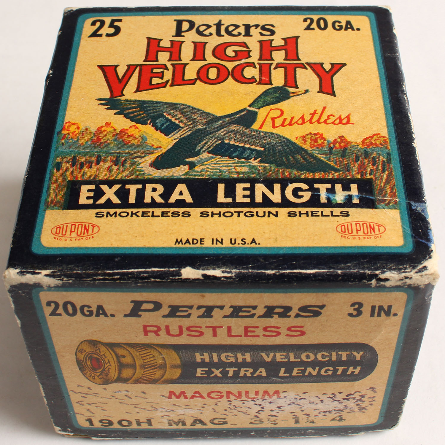 Peters Cart. Div., High Velocity, Extra Length Magnum, 20ga., 3'', 1pc., Full, shot size 4, multi colored box that pictures mallard flying out of the marsh grass, box has light edge wear with great colors, shells are excellent. Grade: Excellent - Value: 30 to 150