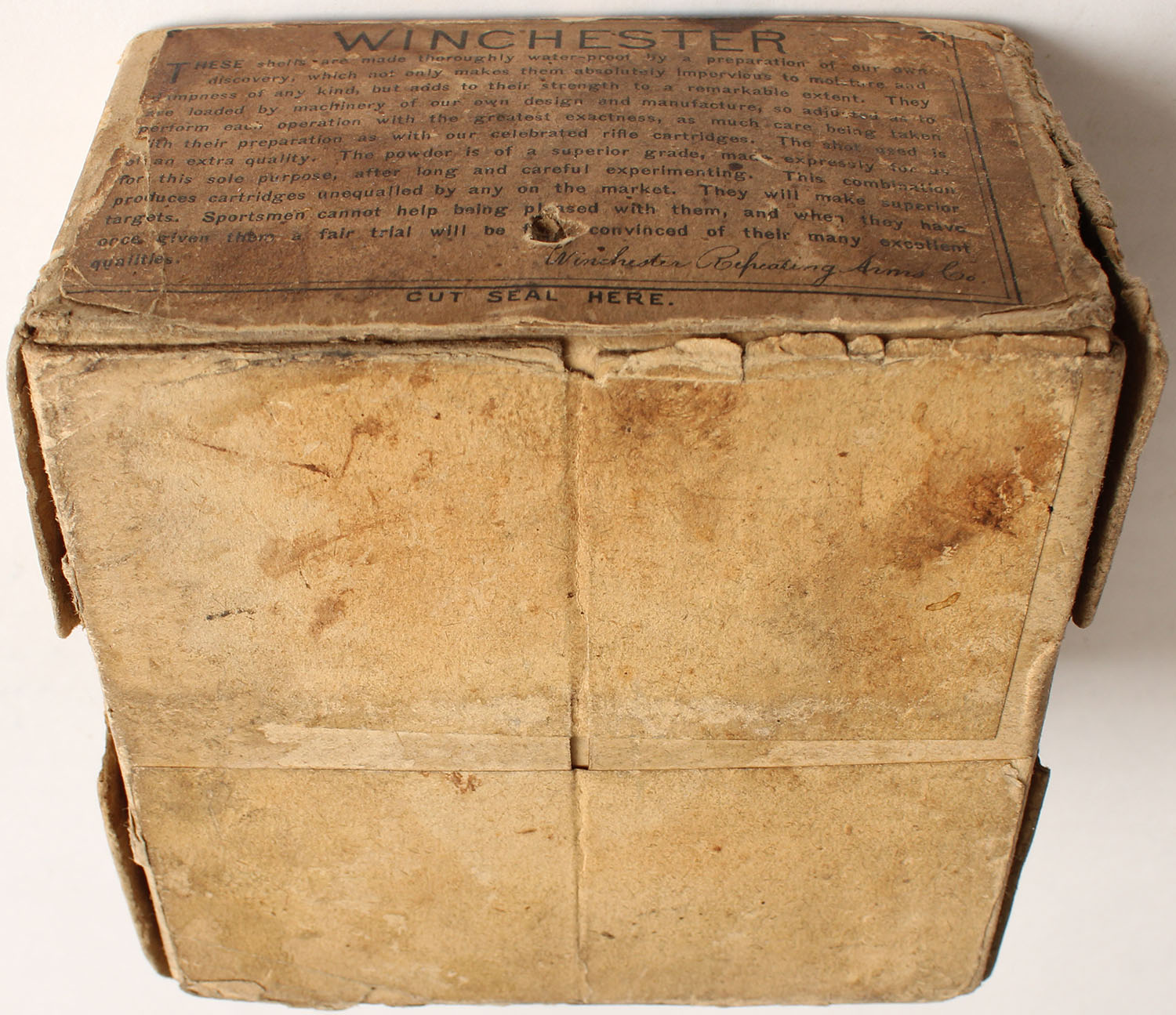RARE!!! Winchester, RIVAL, 12ga., 2pc., Empty, shot size 6, buff box with buff & brown label, has rare CUT-A-WAY shot shell on side, box has seam splits, age soiling, edge wear, light scuffing & label is 95% intact, HARD TO FIND BOX! Grade: Very Good - Value: 100 to 500