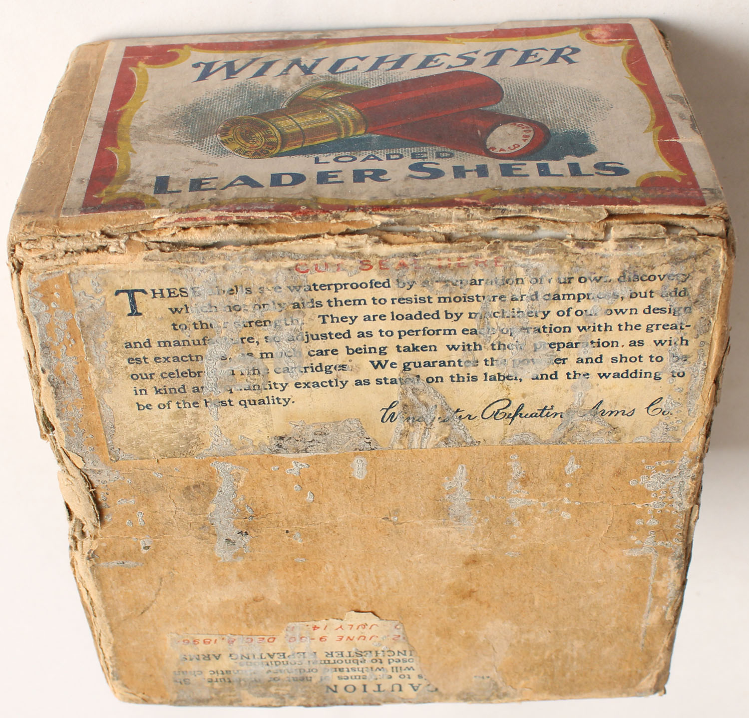 Winchester, LEADER with Insert picturing clay pigeon shooters that says ''No Closed Season on Clay Birds'', 16ga, 2pc., Full, shot size 4, Buff box with red, yellow, white & black label showing lightning bolt, box has edge wear, scuffing, seam splits, tape repair & soiling with nice color to label, label is 90% intact, Shells are good. Grade: Very Good - Value: 100 to 500