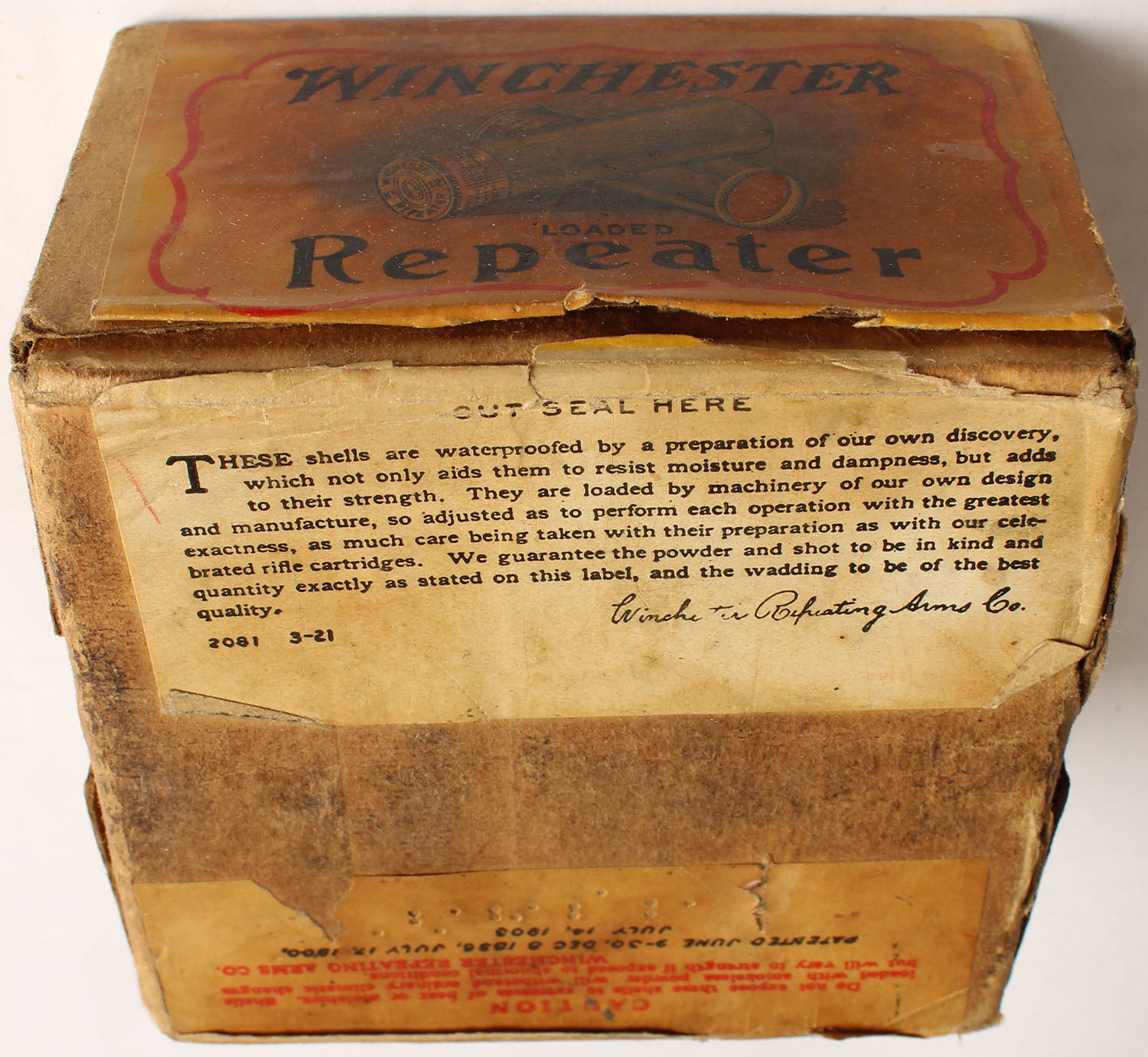 Winchester, REPEATER, 12ga, 2pc., Full of mixed shot sizes, Shot size 1 Ch, Buff box with yellow, white & red label showing lightning bolt, box has age soiling, edge wear & shell protrusions, shells are fair. Grade: Good + - Value: 20 to 100