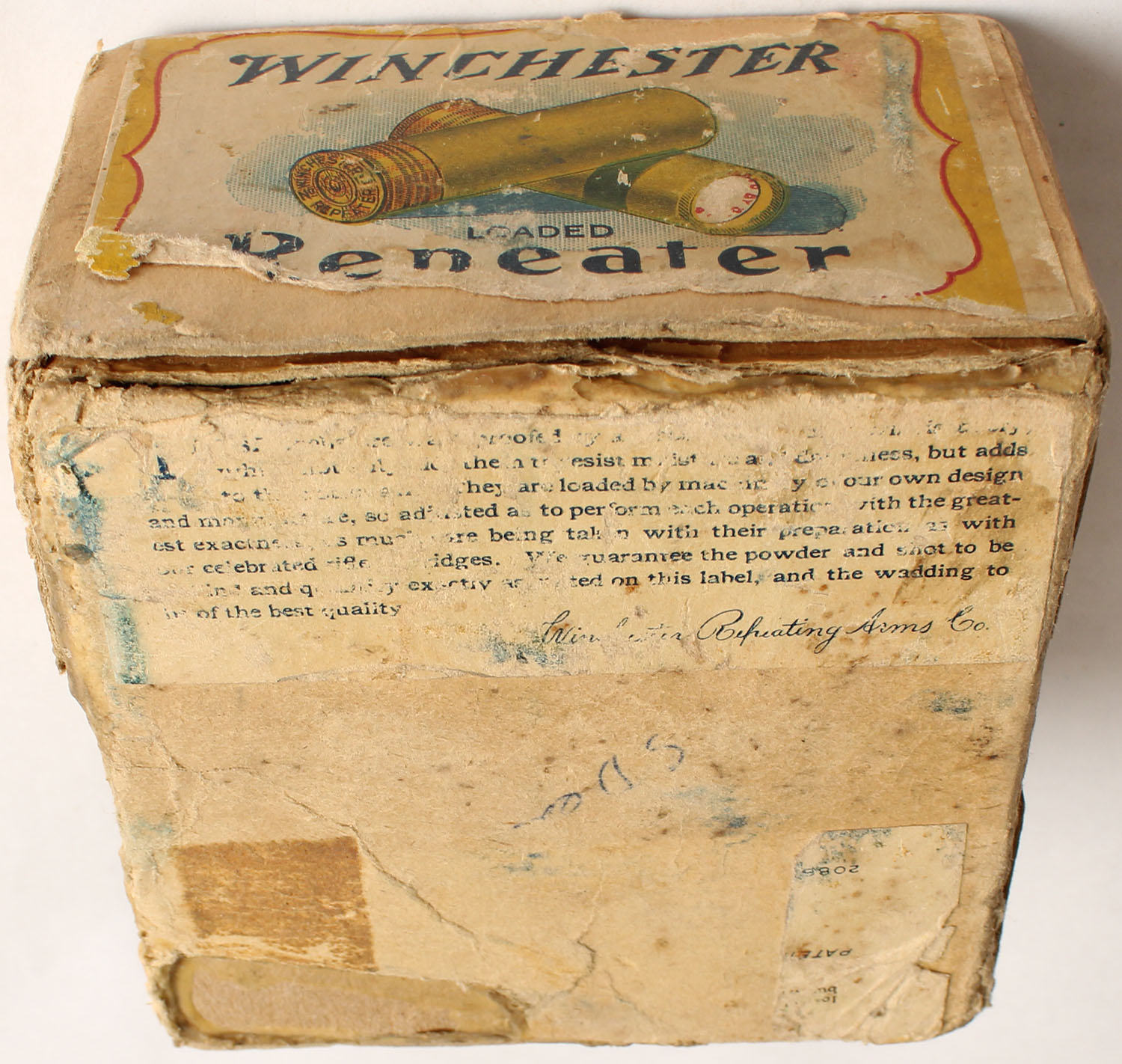 Winchester, REPEATER, 16ga, 2pc., Partial 20rds with 2rds being different shot size, Shot size unknown, Buff box with yellow, white & red label showing lightning bolt, box has seam split, edge wear, light soiling & tears in label & box, Shells are good. Grade: Very Good + - Value: 20 to 200
