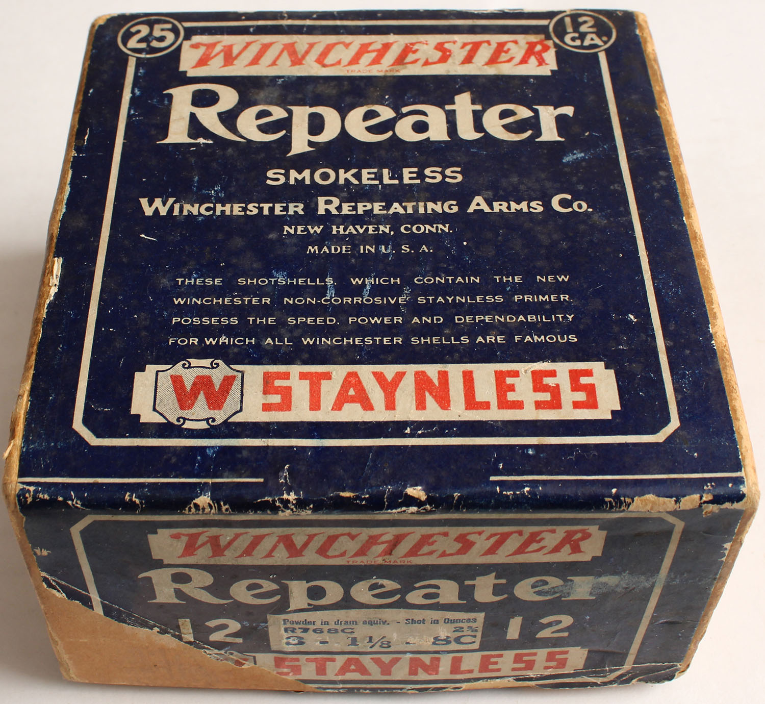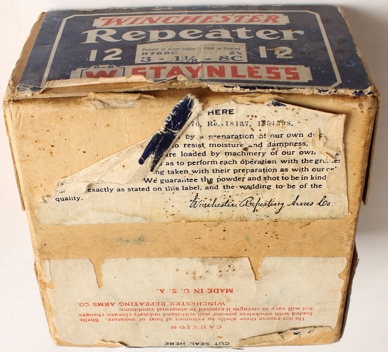Winchester, Repeater, 12ga., 2pc., 2 5/8'', Empty, Shot size 8C, buff box with blue, red & white colored label, box has light age soiling, light edge wear & some tears to label with very nice colors. Grade: Very Good ++ - Value: 20 to 120