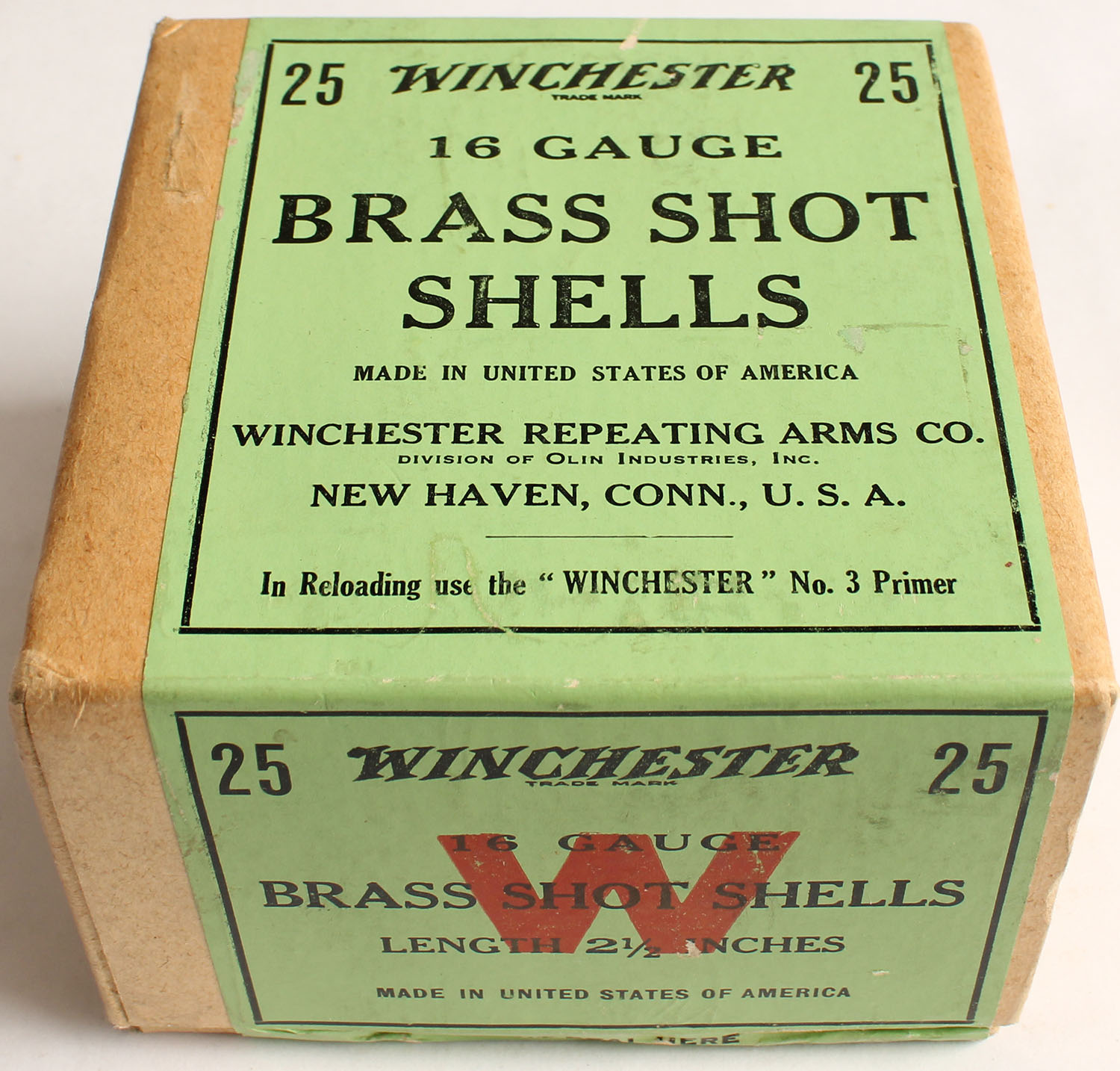 Winchester, BRASS SHOT SHELLS, 16ga., 2pc., 2 1/2'', FULL & SEALED, buff box with green, red & black label, box is very solid & has small shell protrusions with Minty colors to label. Grade: Excellent + - Value: 200 to 600