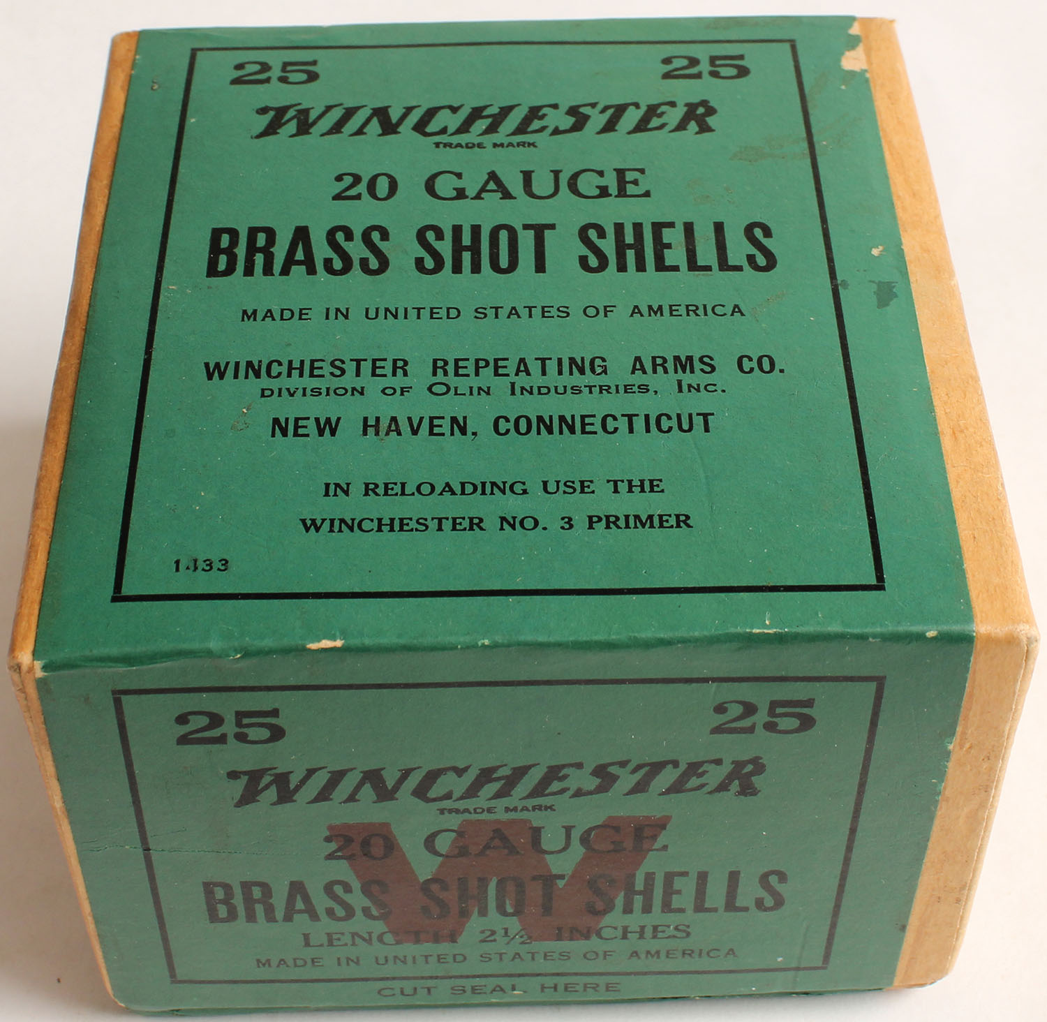 Winchester, BRASS SHOT SHELLS, 20ga., 2pc., 2 1/2'', FULL & SEALED, buff box with green, red & black label, box is very solid with Minty colors to label. Grade: Excellent ++ - Value: 200 to 600