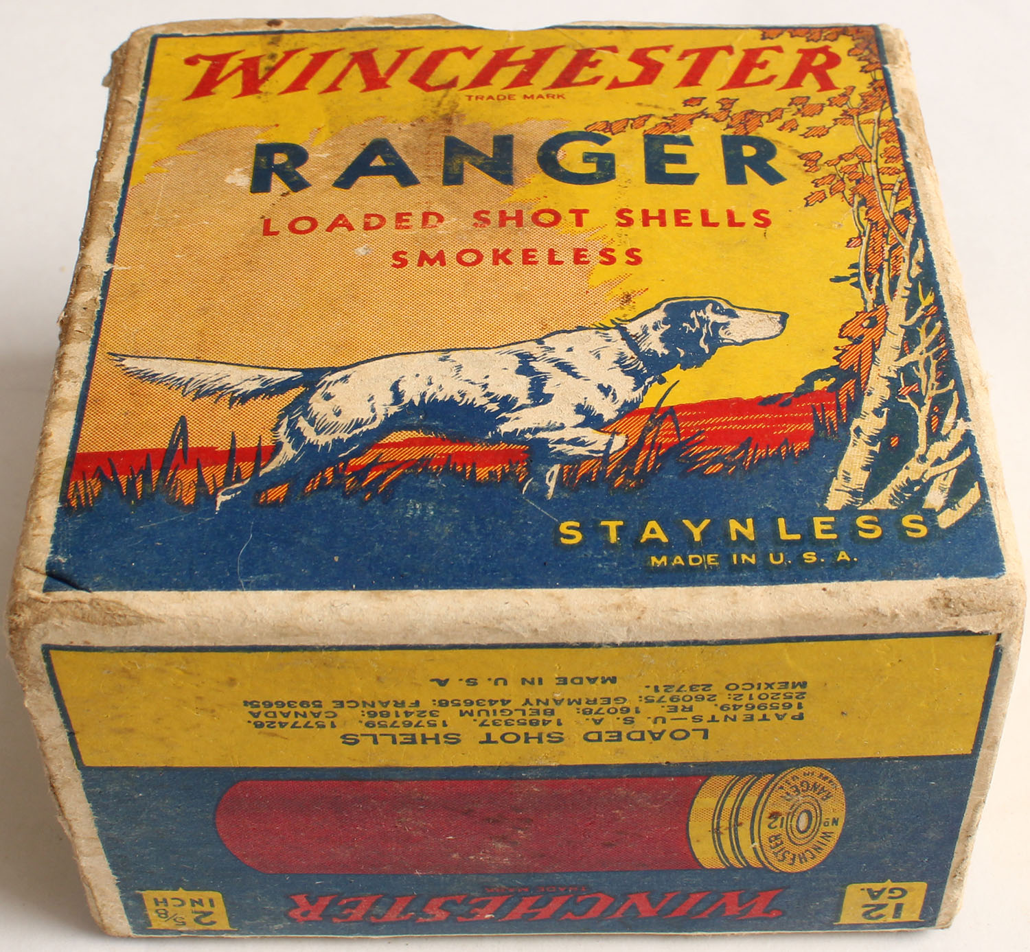 Winchester, Ranger, 12ga, 1pc., 2 5/8'', Partial 19rds with 4rds being Western, Shot Size 6 Chilled, multi colored box with dog on point, box has age soiling, torn inside top flap, edge wear & scuffing with nice colors, shells are good. Grade: Very Good + - Value: 20 to 60